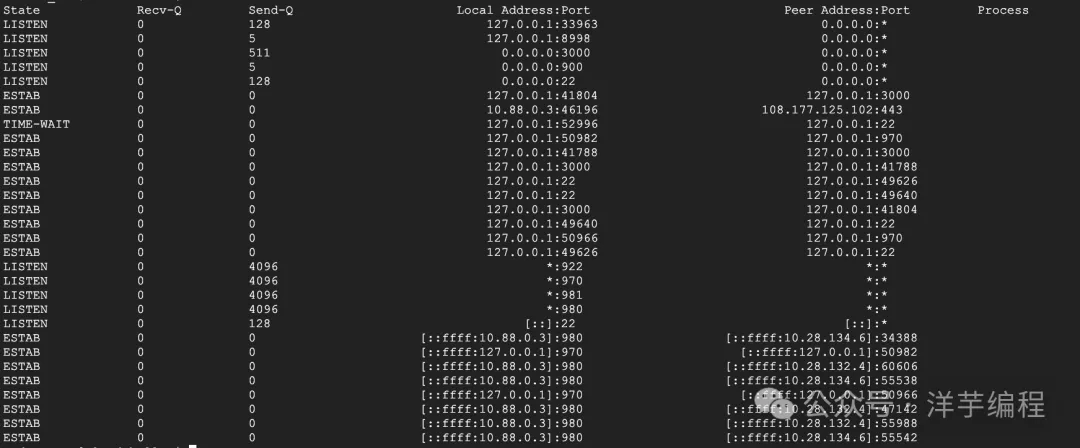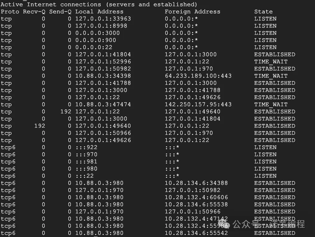 输出 TCP/UDP 网络连接,及其对应的端口号和状态等信息。