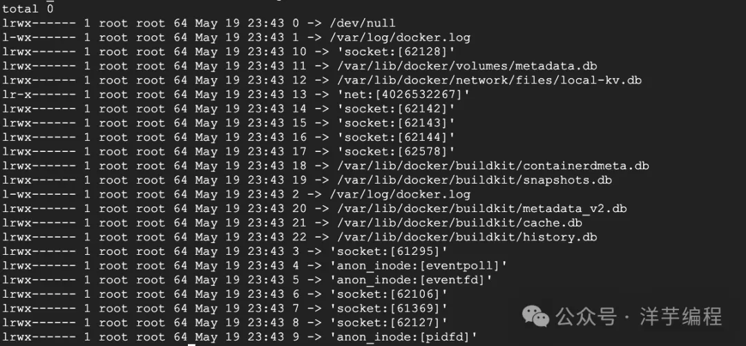 输出 dockerd 进程打开的所有文件句柄 (fd)。