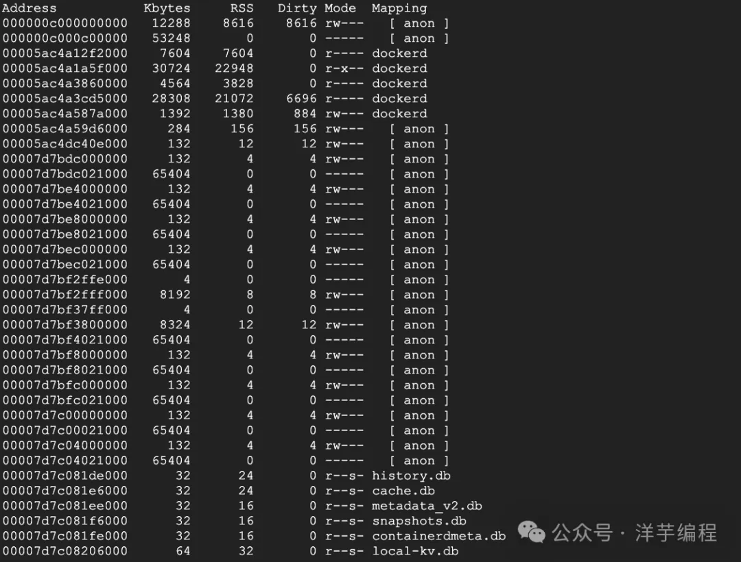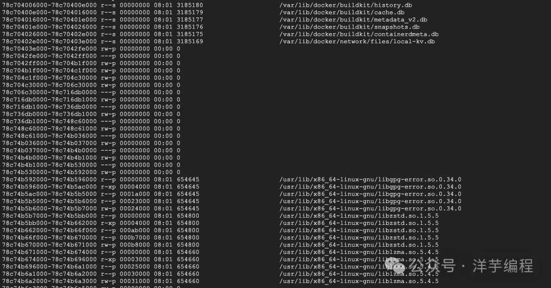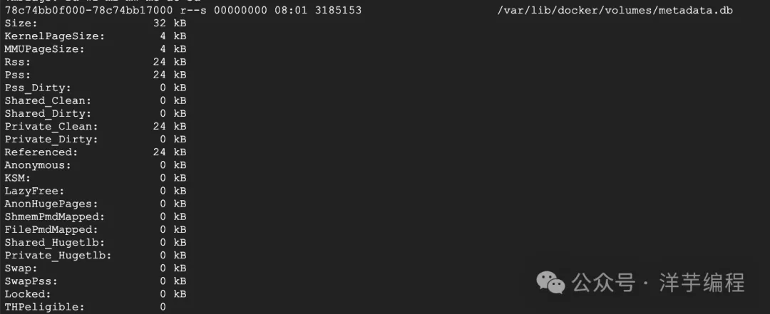 输出进程内存映射区域(例如堆、共享库),smaps 细化到每个区域的 RSS 和脏页统计,用于内存泄漏分析 (具体的分析方法,感兴趣的读者可以自行搜索)。