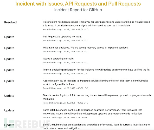 问题解决与后续措施GitHub响应迅速,协调世界时7月29日00:51,团队通报了正在实施的缓解措施,强调仅小部分流量受影响。解决进度随后加快:01:52部署修复方案,监测显示所有受影响区域开始恢复。问题跟踪功能于02:03恢复正常,拉取请求功能于02:05恢复,02:06宣布完全解决,GitHub承诺将尽快发布详细根本原因分析。