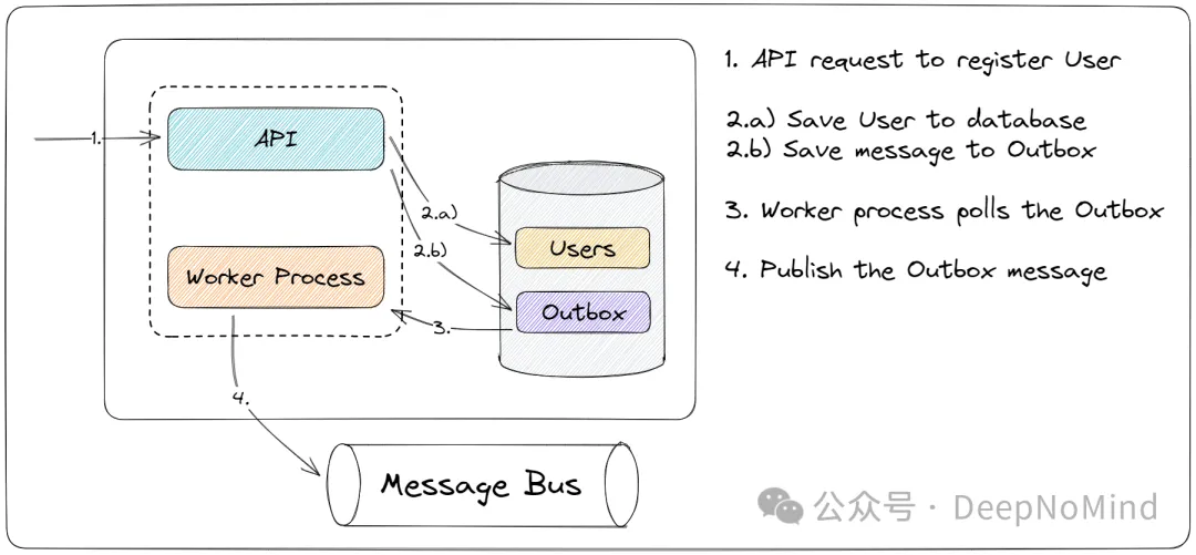 发件箱与工作单元在同一个事务中,因此可以将 User 自动保存到数据库中,并持久化 OutboxMessage。如果保存到数据库失败,则回滚整个事务,并且不会向消息总线发送任何消息。