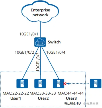 某个公司的网络中,网络管理者将同一部门的用户划分到同一VLAN。为了提高部门内的信息安全,要求只有本部门的用户才可以访问公司网络。如图1所示,User1、User2和User3接入公司安全性较高的机要部门,要求只有这三个用户可以通过Switch访问公司的网络,如换成其他外来的用户则不能访问公司网络。