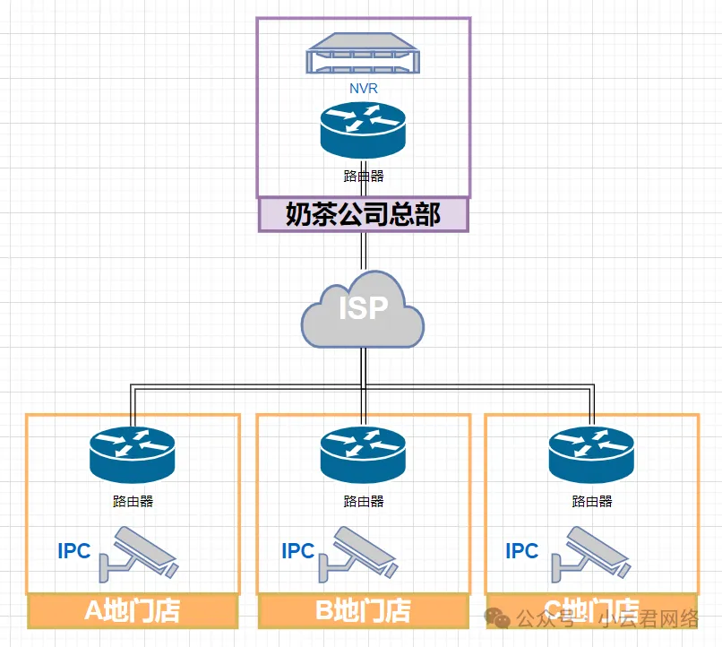NVR—总部<——>A门店—IPCNVR—总部<——>B门店—IPCNVR—总部<——>C门店—IPC