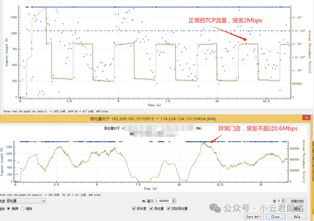 统计下吞吐量,发现正常A、B门店的视频流是可以平滑的达到2Mbps的,而异常的C门店达到0.6Mbps就上不去了: