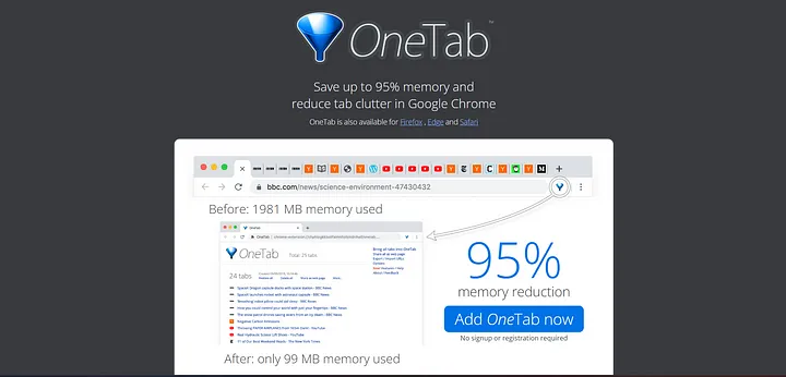 OneTab 可将当前打开的所有标签整理为一个可点击列表,既减少内存占用,又能保留全部页面记录,适合“标签堆积症”患者使用。