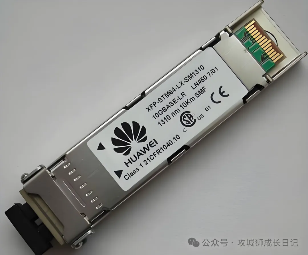 根据10GBASE-LR距离标识可以确认这单模光模块。这是一款华为(HUANWEI)的 XFP 封装光模块,型号为 XFP-STM64-LX-SMH310,支持 10GBASE-LR 万兆以太网标准。工作波长为 1310 nm,最大传输距离 10 公里,需搭配单模光纤(SMF)使用。