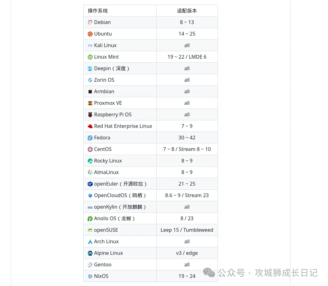 已适配Debian、Ubuntu、Kali Linux、Linux Mint、Deepin、Zorin OS、Armbian、Proxmox VE、Raspberry Pi OS、RHEL/CentOS、Fedora、Rocky Linux、AlmaLinux、openEuler、OpenCloudOS、openKylin 等 23+ 种发行版与版本。