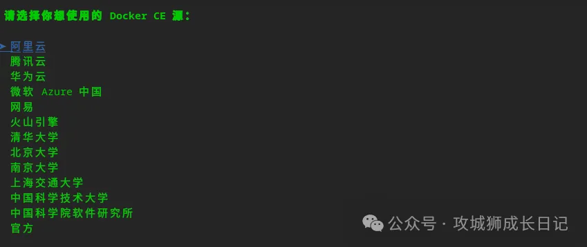 在你运行了上述命令之后,屏幕上会出现一个选项列表,如下图所示。你可以从这个列表中选择一个你喜欢的镜像源来安装Docker哦。