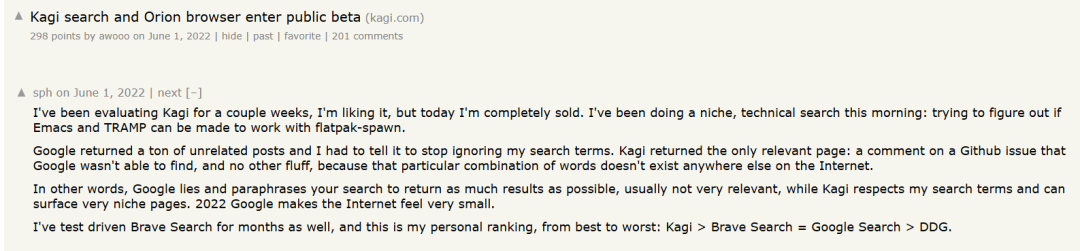 2022 年 6 月 1 日,一则 HN 的热帖成功让 Kagi 出圈。