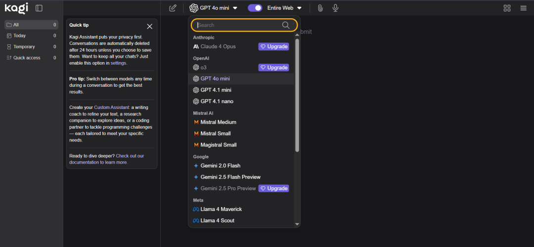 因此,Kagi 推出了 Assistant,一个可自定义、注重隐私的多大模型平台,并接入了 Kagi 搜索。随后,又上线了 Translate,起初只是一个“做得更好、支持更多语言”的翻译工具的朴素愿望。在一众用户的反馈推动下,Assistant 也很快成为了用户喜爱的功能之一。