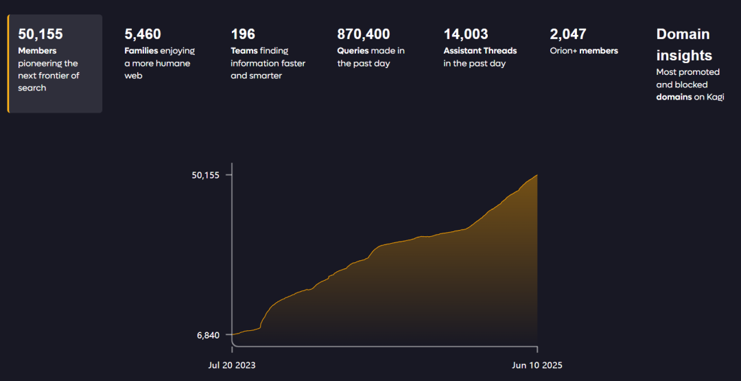 Kagi 付费社区现在有超过 50,000 名成员,其中包括 5,000+ 个家庭用户与近 200 个团队;日搜索请求量逼近 100 万次;Orion 浏览器下载量突破 100 万;Discord 社区人数超过 7,400 人;图片