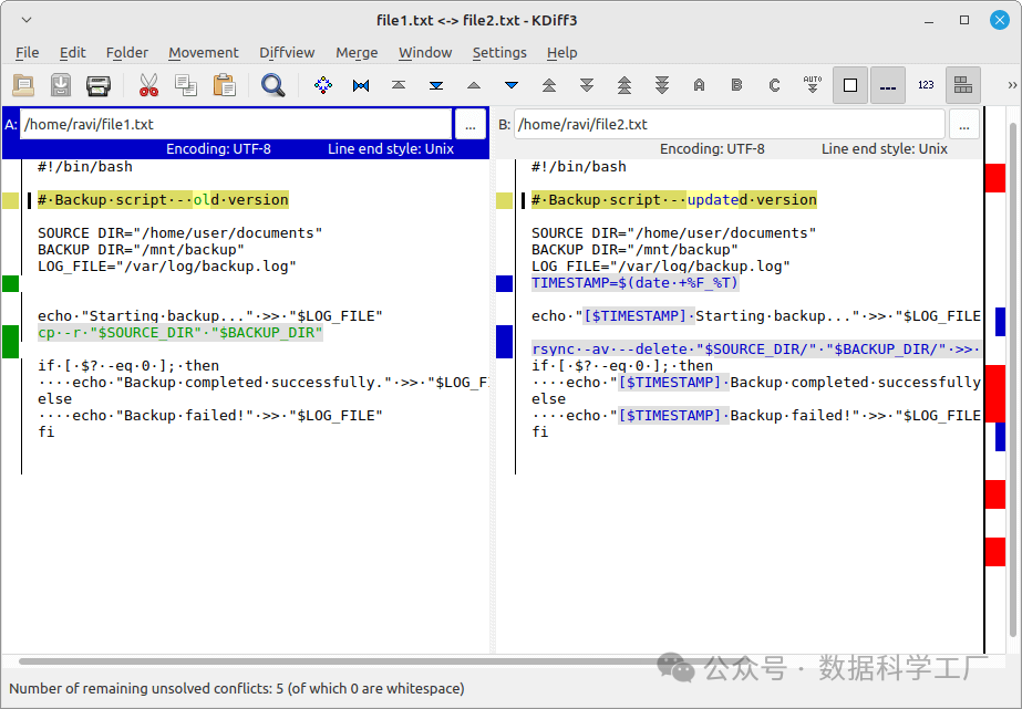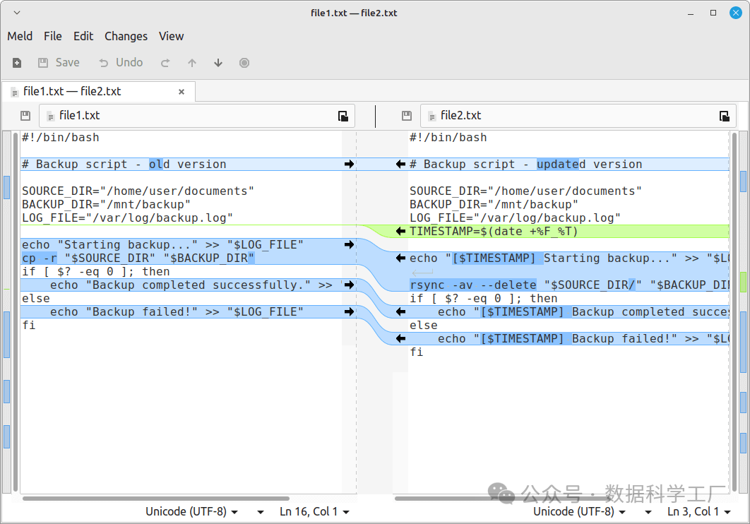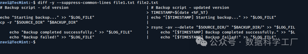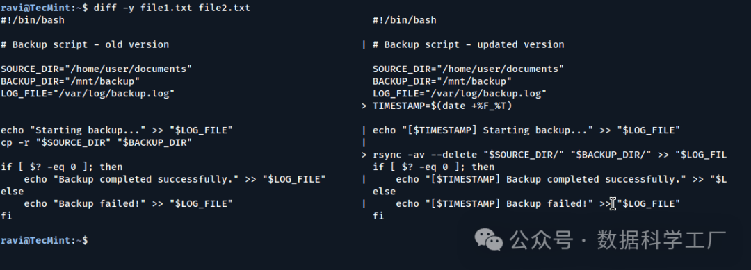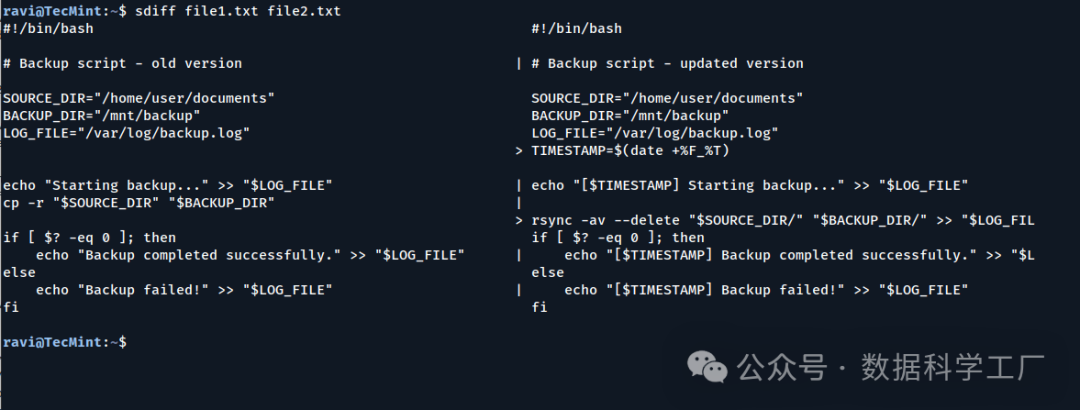 diff 命令是一款经典且强大的工具,它在所有 Linux 系统上都有配备,能够逐行比较两个文件并显示出它们之间的差异。