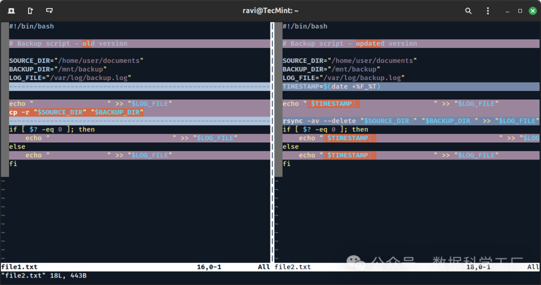 对于熟悉 Vim 的用户而言,vimdiff 是一款强大的工具,它能够并排比较两个文件,并利用颜色和标记来突出显示差异。