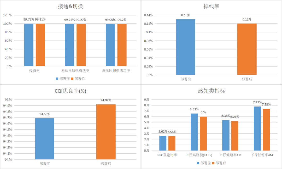 推广区域内5G系统间切换成功率改善0.15%,其它性能类指标均保持平稳,试点期间无新增投诉;感知类指标中,CQI优良率改善0.23%,RRC重建比率改善0.06%,上行高路损占比改善0.53%,上行UE低速率占比改善0.17%,下行UE低速率占比改善0.39%,整体指标均有所改善。