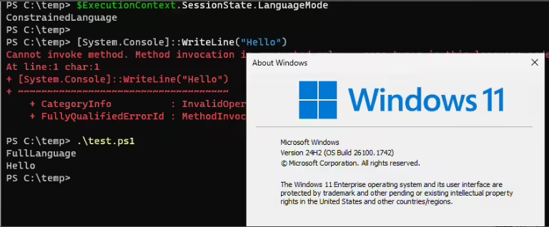 微软曾于 2023 年简化 AppLocker 的部署流程,但在 2024-2025 年的测试中不够完善。Stack Exchange 论坛用户 CFou 率先发现问题,指出 ConstrainedLanguage 模式无法正常执行,PowerShell 会话默认使用 FullLanguage 模式。