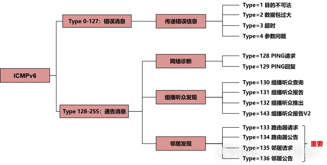 Type字段定义了ICMPv6报文的消息类型;Code字段取决于Type值,可将ICMPv6报文细分为更具体的用途。l以下是ICMPv6报文的一些重要的用途和分类,其中邻居发现是最重要的部分,是IPv6邻居节点互相通信的基础。