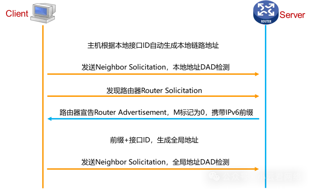 无状态地址自动配置协议通过RA和RS交互实现,详细流程如下: