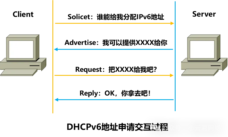 DHCPv6定义了多种报文类型(Msg-type),最重要的地址申请主要由Solicit、Advertise、Request、Reply四种类型的报文交互实现。