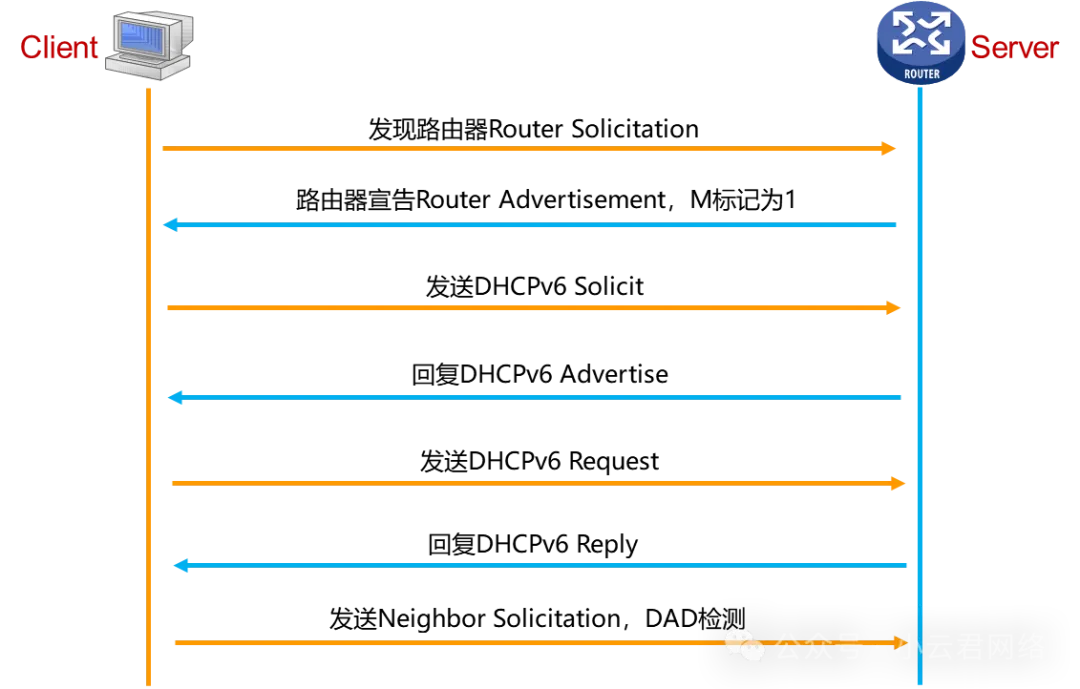 有状态地址自动配置地址获取主要通过DHCPv6交互实现,其中也涉及到路由器发现和重复地址检测的过程,其主要流程如下: