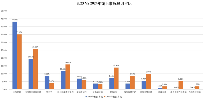 下图是某知名互联网公司对其线上事故原因进行统计分析后得出的结果。从图中可以看出,接近一半的线上事故问题,都可以追溯到业务代码逻辑的缺陷或不合理之处。这进一步凸显了代码质量和架构合理性在软件系统稳定运行中的重要性。