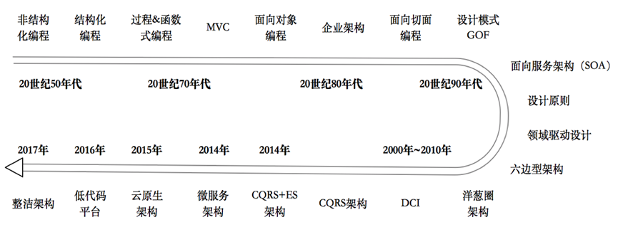 鉴于如今系统愈发复杂,需求不确定性增加,在当今 VUCA 时代(易变性、不确定性、复杂性、模糊性),回顾软件危机及软件工程发展历程显得尤为重要。面对复杂混乱的历史遗留系统问题,软件工程宛如一剂良方。维基百科定义软件工程涵盖 “软件开发技术” 和 “软件项目管理” 两方面。其中,“软件项目管理” 主要涉及项目管理知识体系,如 RUP 和敏捷 Scrum 等,暂非本次重点。“软件开发技术” 才是我们关注的核心,包括结构化编程、面向对象开发、MVC、领域驱动设计、整洁架构等开发方法。以下是按时间维度梳理的部分常见软件开发方法: