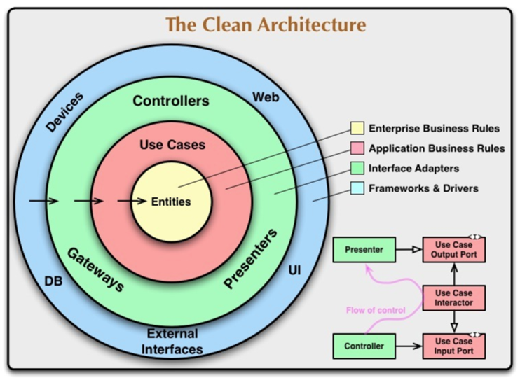 3.接口依赖方向 :所有接口(Controllers/Gateways/Presenters)只能向圆圈内部依赖,不能反向依赖。例如,Controller 可以调用 Application,但 Application 不能调用 Controller 接口。对于数据库操作,以往常常直接将 Entity 领域对象传递到 Mapper 对象中,导致领域对象严重依赖数据库操作对象。在 DDD(领域驱动设计)中,应通过依赖反转来改变这种现象(整洁架构借鉴了 DDD 的很多概念,比如 Repository 等)。