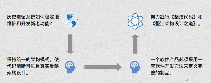 因此,想让历史遗留系统保持稳定,既能顺畅维护,又能顺利支持新老功能的开发,关键在于以团队熟悉的风格来设计和开发系统,使代码与结构清晰直观,确保代码能如实体现架构设计,力求达到“代码即设计”的境界。总的来说,就是要保持架构模式的统一,确保代码清晰且如实映射架构设计。