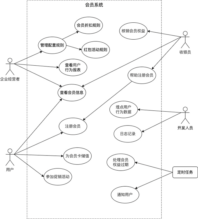 会员注册:用户可以通过会员系统注册为会员,会员系统将收集用户的个人信息,并为其生成唯一的会员账号(通常为手机号码)。会员信息管理:对会员的详细信息进行管理,包括个人资料、会员状态和消费历史等。奖励和折扣管理:基于会员的忠诚度、购买历史或其他标准为会员设计奖励和折扣。积分和奖励:会员在满足一定条件的消费条件后可以获得积分或奖励,并可在未来的消费中使用这些积分或奖励。会员系统应在结账时显示可用的积分,并方便用户使用。会员触达:通过电子邮件或短信等方式向会员发送促销活动通知。2.通过用例梳理分析需求
