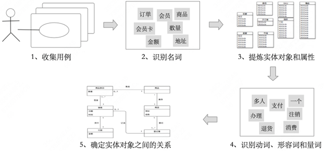 3.通过识别名词短语寻找概念类,又称为用例建模法。该方式是我重点推荐的方式,我们可以通过对所有详细用例的文本进行分析,识别出其中的关键名词和名词短语,将其作为候选的概念类或属性。如下图所示步骤: