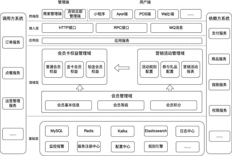 我们需要先把架构设计做好水平和垂直划分,对应于DDD中提出的战略设计部分,他是架构设计中的核心稳定的主体结构,就像设计房屋大厦中的主体结构一样,一经设计,未来如果需要大变动,那么将会付出非常大的代价的。在软件的架构设计中,这个主体主要包括微服务如何划分,各服务之间的依赖关系是什么样的,以及各微服务内部的层次结构是什么样的。在会员系统项目中,各微服务和模块设计如下图所示: