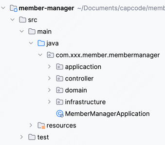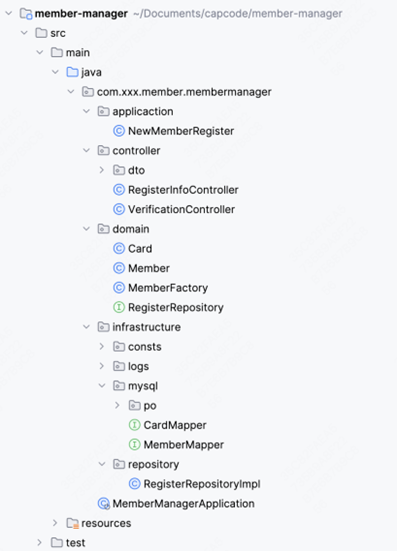 在上图中创建了会员(Member)对象与会员卡(Card)对象等领域对象,并且会员对象与会员卡对象为一对多的关系。在具体的实现过程中,代码必须真实地反映领域模型,若在代码实现中发现之前设计的领域模型不合理,就需要及时地调整设计中的模型结构,尽量保证模型和代码始终一致。在创建领域实体对象后,我们还需要在应用层实现业务流程,并调用相应的领域对象来完成业务逻辑处理。会员系统案例中会员注册用例场景的业务流程编排逻辑代码示例如下: