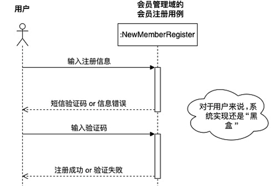 在上图中只反映了用户与系统之间的交互关系。因为用户只关心如何使用系统达到自己的目的,所以我们在前期优先设计用户与系统之间的交互关系,而且此时系统实现对于用户来说还是“黑盒”,后续可以继续对该“黑盒”(新会员注册对象NewMemberRegister)进行完善。在这里,用户和新会员注册对象之间的两次交互对应分层架构中的接口层(可能有两个接口),而新会员注册对象对应分层架构中的应用层。为了实现用户与系统之间的两次交互,在应用层的新会员注册对象中就需要具备对应的业务流程,对于其详细的业务流程,可以继续使用UML流程图或时序图来完善设计。这里使用UML时序图来完善新用户注册的详细业务流程,下图所示为关于新用户注册的业务流程时序图。