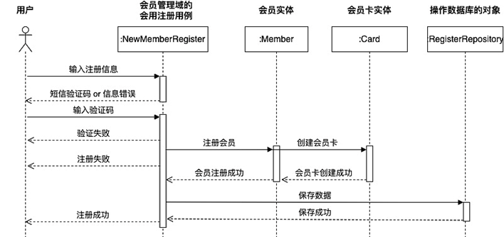 在前文中介绍了如何根据用例来分析和划分领域和子域,根据领域和子域创建了微服务和服务内的模块,并且提炼了对应领域的领域模型,接下来将根据核心详细用例继续设计系统内部的具体实现逻辑。根据详细用例,我们可以找到用户和系统之间的交互关系。在会员系统中,根据会员注册这个详细用例,我们采用UML时序图来设计用户和系统之间的交互关系,如下图所示: