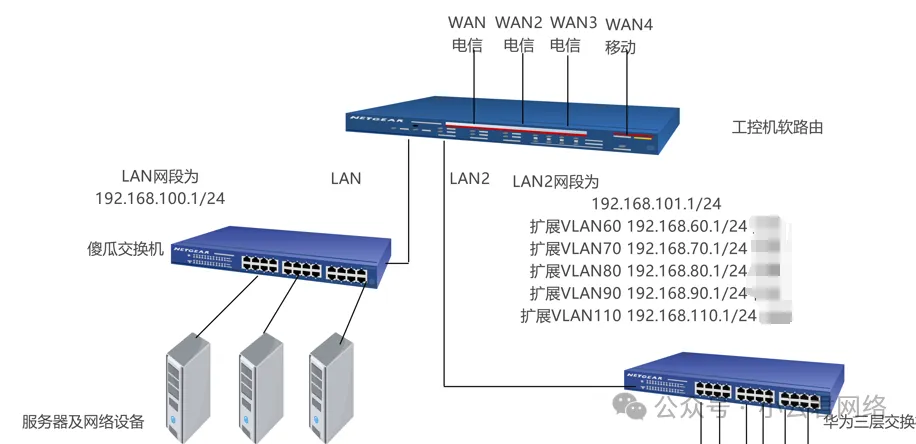 三层网络架构,划分了多个VLAN供业务部门使用。