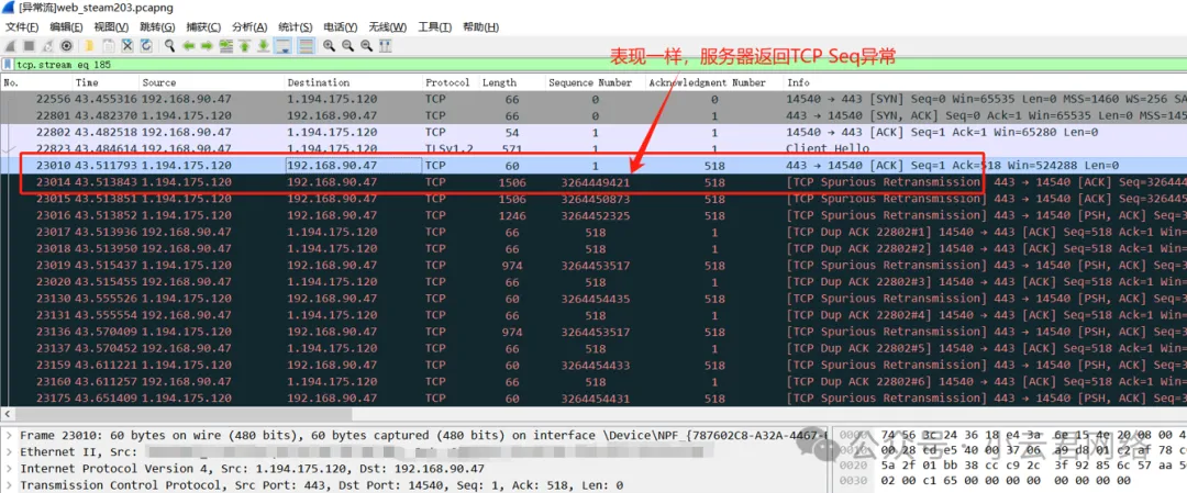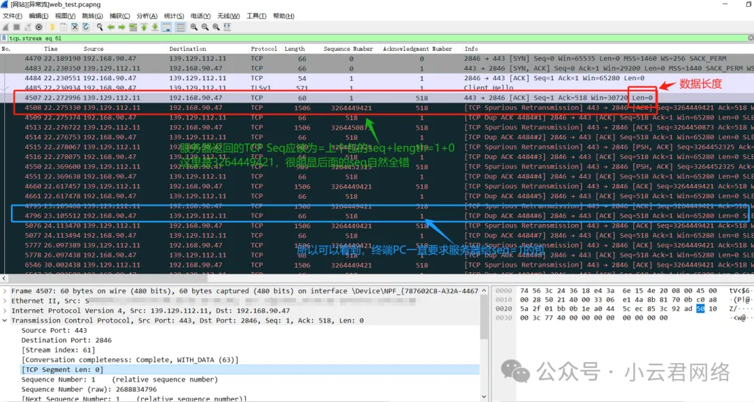 (2) 直接来看PC抓取访问该Web的异常TCP流(抓包中的对应stream61),可以看到服务器响应的Seq明显出了问题:握手之后的服务器—>终端第一个包的seq为1,下来的报文应该seq=1+length=1+0=1,但却变成了3264449421: