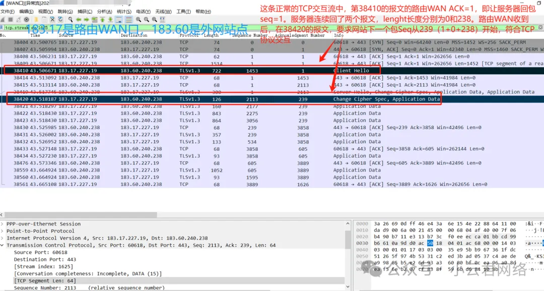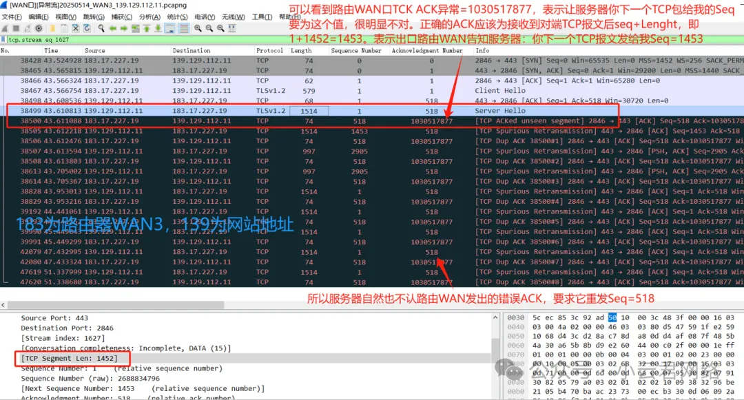 可以明确看到路由器WAN与网站服务器TCP交互的过程中,路由WAN响应的ACK值明显不对,给了一个非常大得错误值,而不是ack=seq+len。
