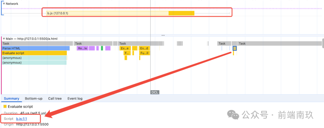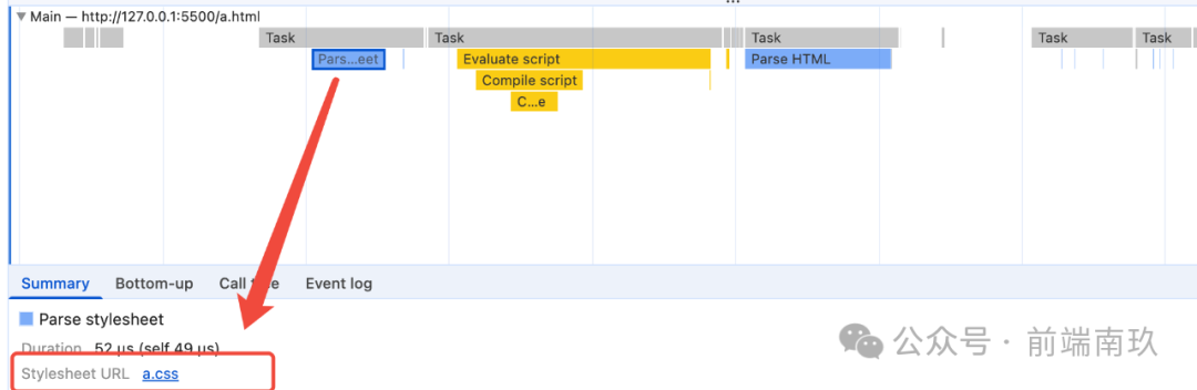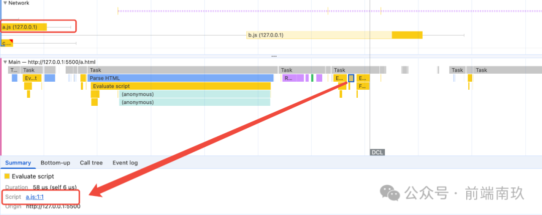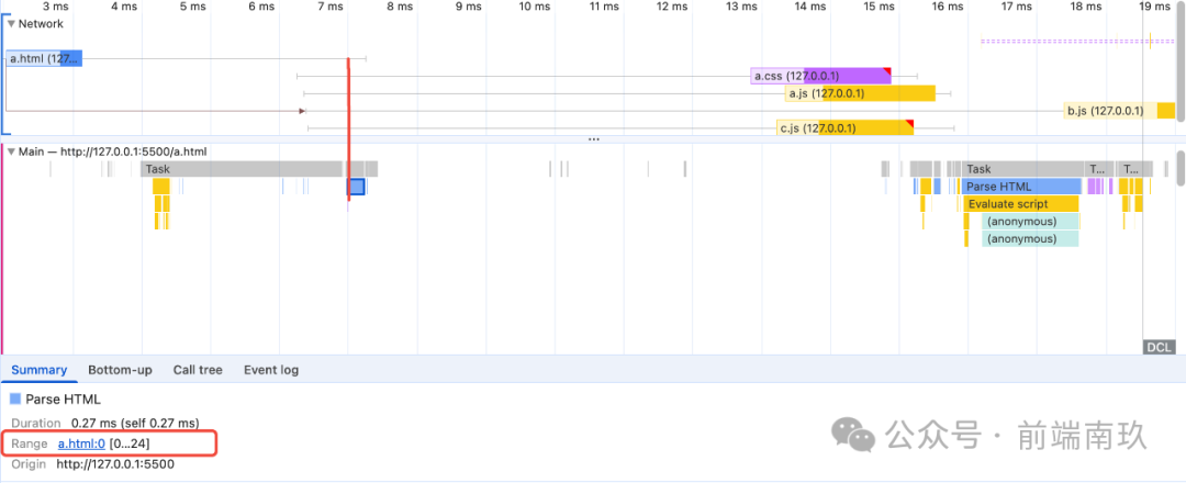 注意看红线位置,这是html开始解析的时间点,从network模块上看,内部的css与js资源竟然在这之前就发起了请求,这也就验证了为了加速,浏览器的预加载扫描器会同时运行,如果在 html 中存在 <link>、<script>、img 等标签,预加载扫描器会把这些请求传递给浏览器进程中的网络线程进行相关资源的下载。