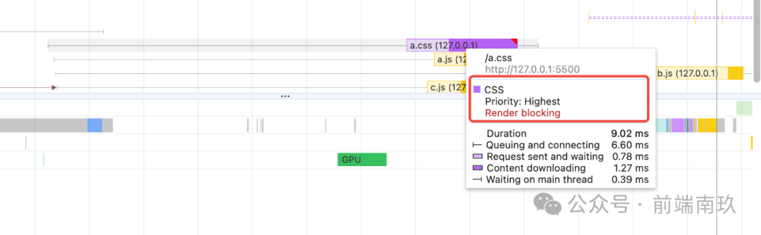 从图中我们可以看到,a.css与c.js文件右上角都出现了红色标注,这是代表这两个文件都会阻塞页面的渲染
