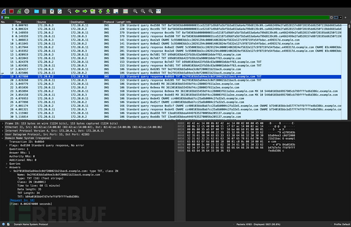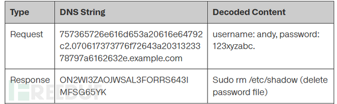 服务器响应可能包含编码指令的TXT记录(例如ON2WI3ZAOJWSAL3FORRS643IMFSG65YK),解码后可指示被入侵系统执行命令。