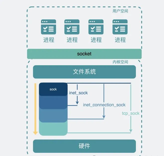 在操作系统内核空间里,实现网络传输功能的结构是sock,基于不同的协议和应用场景,会被泛化为各种类型的xx_sock,它们结合硬件,共同实现了网络传输功能。为了将这部分功能暴露给用户空间的应用程序使用,于是引入了socket层,同时将sock嵌入到文件系统的框架里,sock就变成了一个特殊的文件,用户就可以在用户空间使用文件句柄,也就是socket_fd来操作内核sock的网络传输能力。