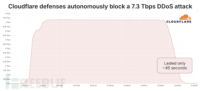 2025年5月中旬,Cloudflare成功抵御了史上最大DDoS攻击,峰值流量达到惊人的7.3Tbps(太比特每秒),每秒处理数据包高达48亿个。这次史无前例的攻击虽然仅持续45秒,但向目标输送了37.4TB数据,相当于将9350部高清电影或7480小时高清视频压缩在不到一分钟内传输完毕。