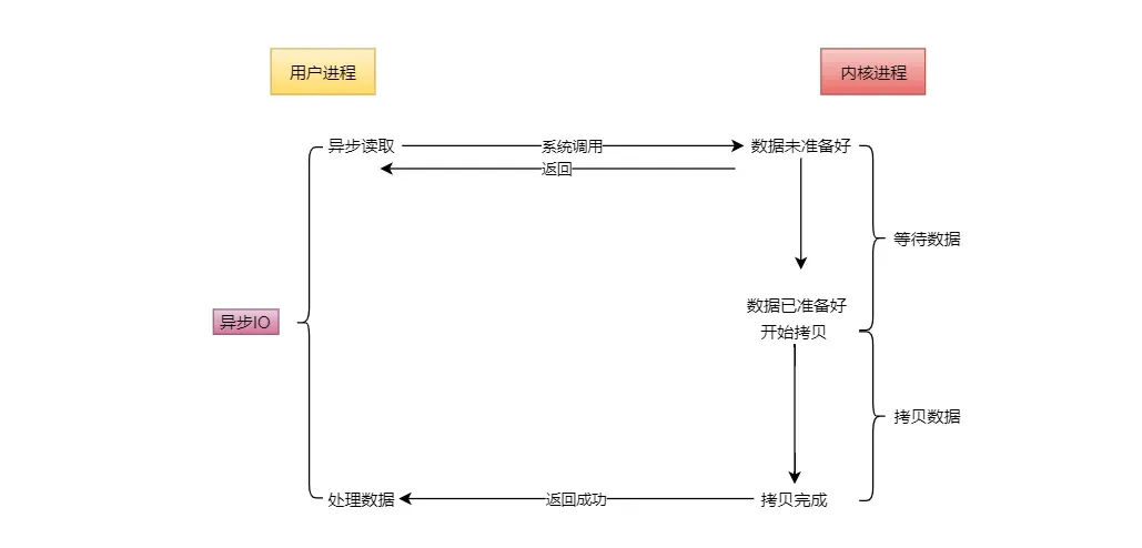 在异步 I/O 模型中,当进程发起一个 I/O 操作时,会立即返回,不会被阻塞,也不会立即返回结果。内核会负责完成整个 I/O 操作(包括数据准备和复制到用户空间),并在操作完成后通知进程。如果 I/O 操作成功,进程可以直接获取到数据。