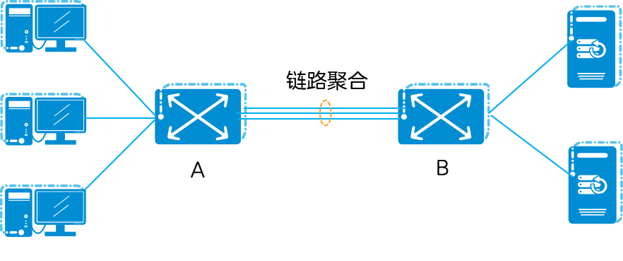 当A、B之间链路采用链路聚合时,这些链路不再是单条链路独立工作,对外成为一条逻辑链路。因此,不使用STP(Spanning Tree Protocol,生成树协议)也不会产生环路,有效避免了A、B之间产生二层环路的风险。