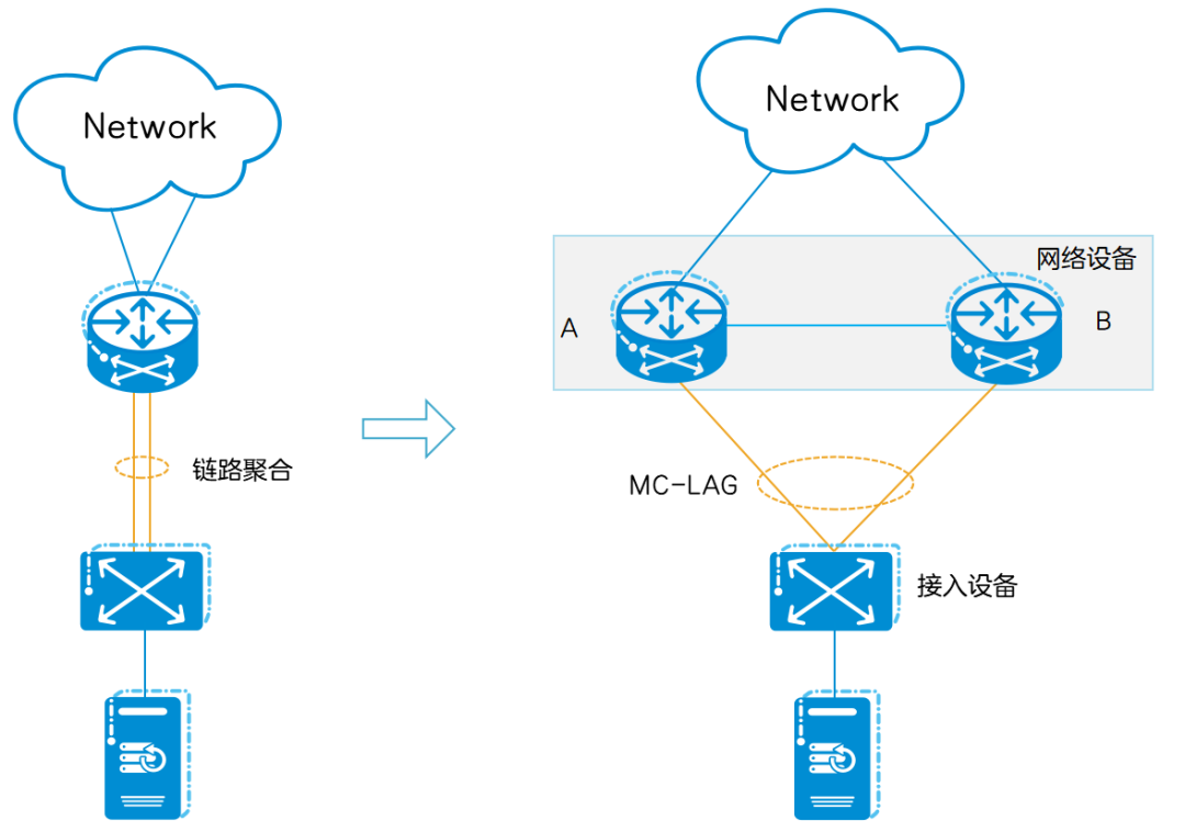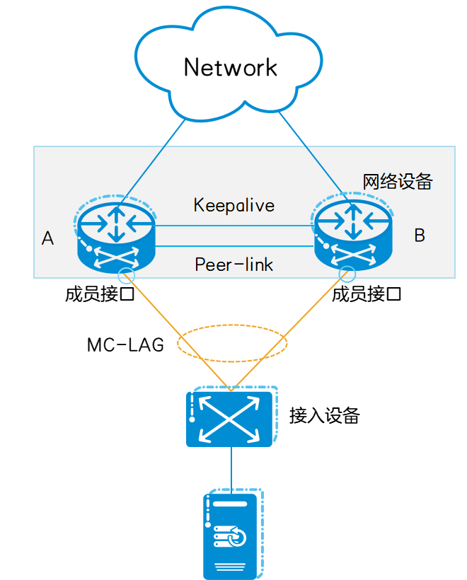 当一台接入设备(可以是服务器或交换机)与上层两台网络设备A和B对接时,可采用MC-LAG技术组成跨设备链路聚合组。
