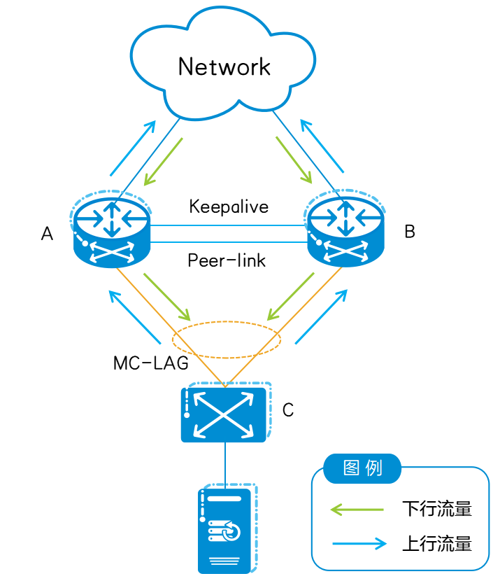 MC-LAG主要应用于双归接入场景,即接入侧设备C通过MC-LAG技术,接入网络侧设备A和B。正常工作时,上行流量和下行流量采用负载均衡方式经设备A、B转发。