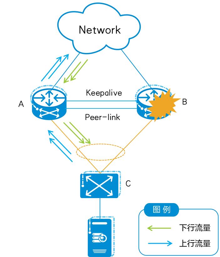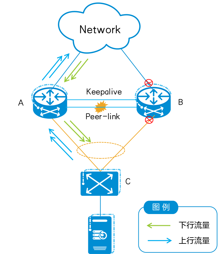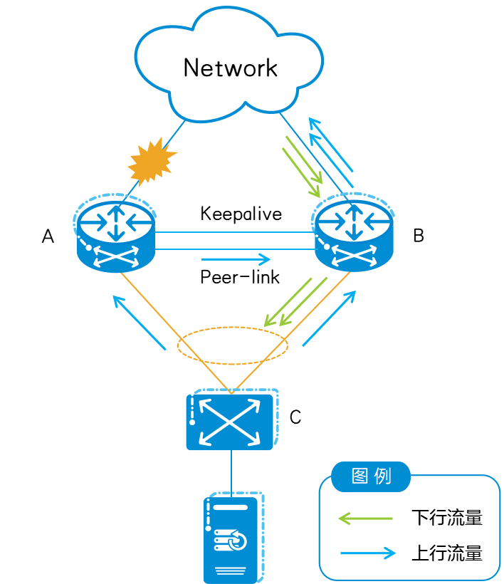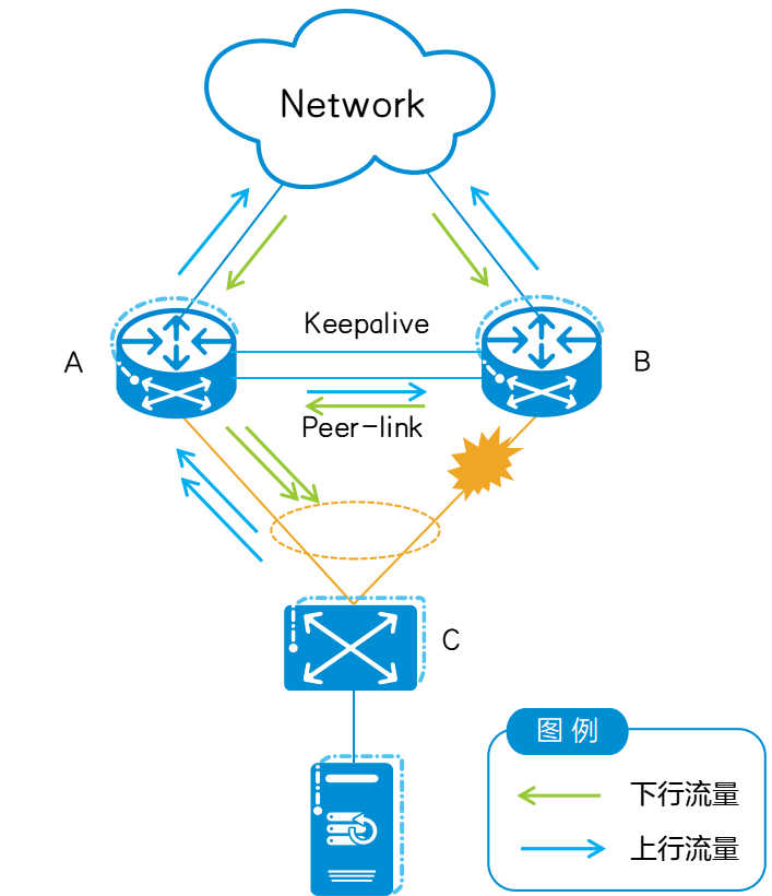 如果发生上行链路故障,设备C的上行流量到达设备A后会通过Peer-link发送给设备B进行转发(也可以配置上下行端口联动,上行流量全部从设备C直接送到设备B进行转发)。