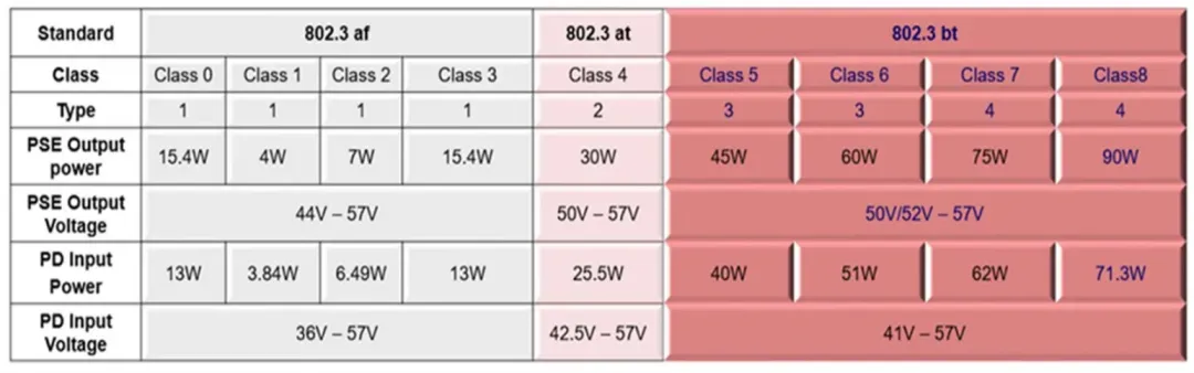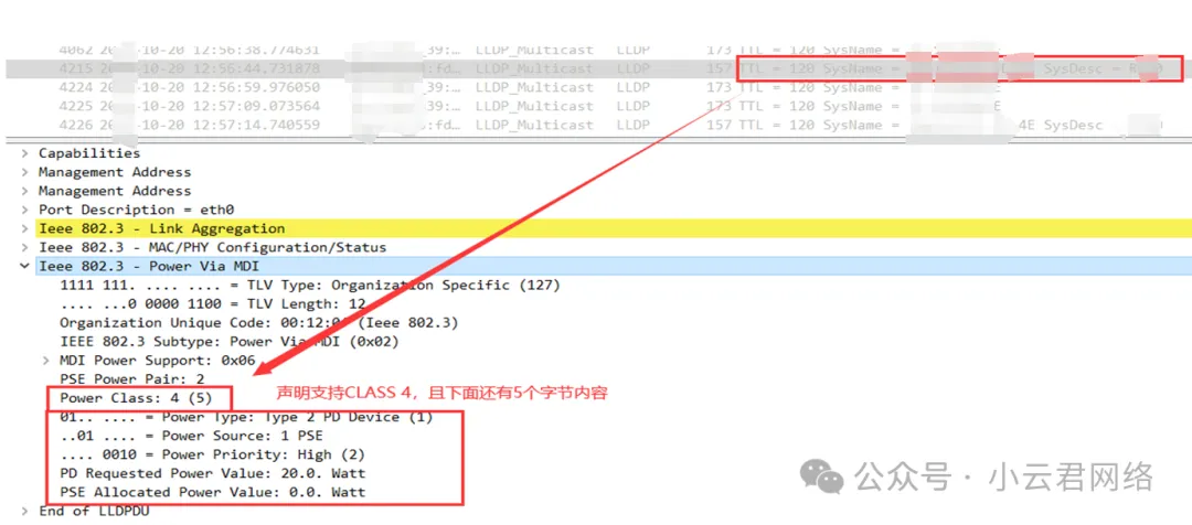 发现能收到PD设备发出的LLDP报文,Class等级字段对应的值为5,即class 4 802.3at,供电标准参考: