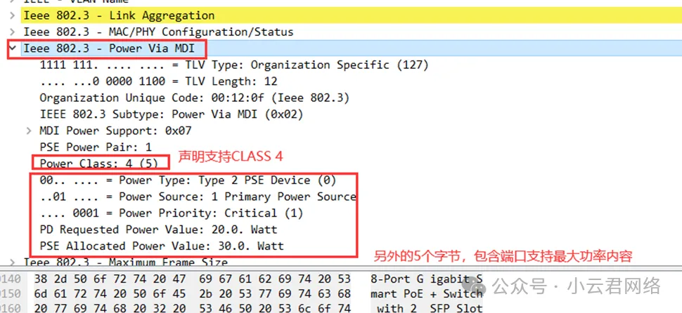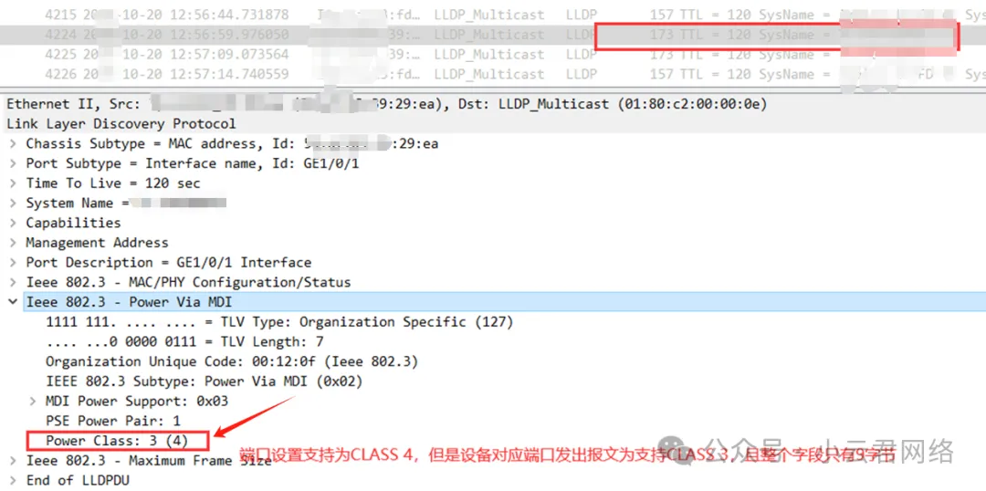 很明显这是有问题的,字段中Power Class字段定义错误,协议定义支持Class 4的端口对应的值应该为5,但这里是4表示只支持Class 3,也就是802.3af模式。