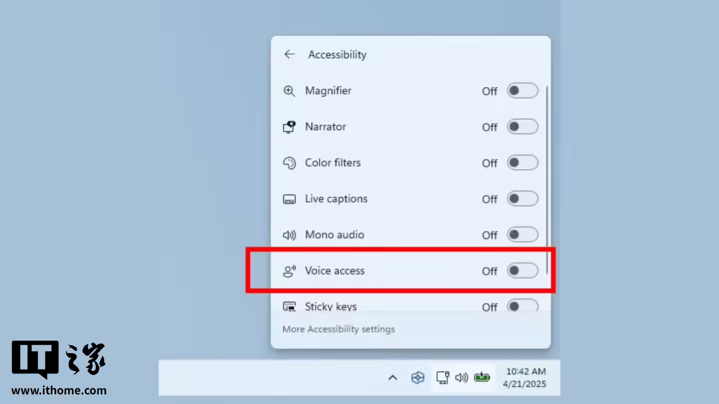 不过,这一问题终于在今天发布的 Windows 11 预览版 26120.3872(Beta 频道)和 26200.5562(Dev 频道)中得到了解决。新版本的快速操作面板在系统托盘的无障碍菜单中新增了语音访问的开关。