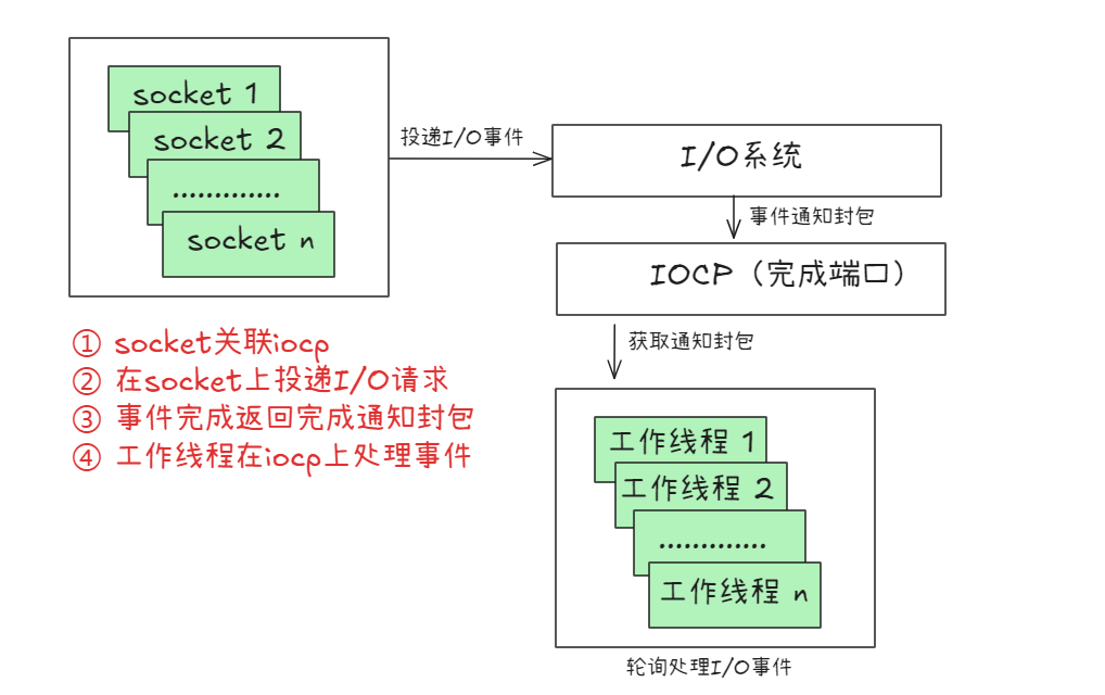 ① socket关联iocp② 在socket上投递I/O请求③ 事件完成返回完成通知封包④ 工作线程在iocp上处理事件